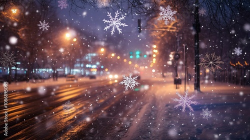 On a blurred background, snowflakes are decorated with street lights at night