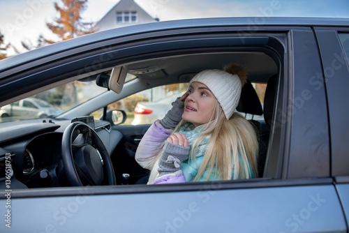 On a chilly winter day, a woman sits comfortably in her car, engaging in a phone conversation