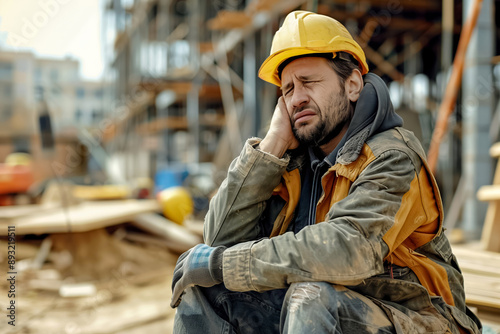 On a construction site, a worker in a yellow hard hat and jacket sits down in discomfort, holding his head in pain. The job seems to be physically taxing