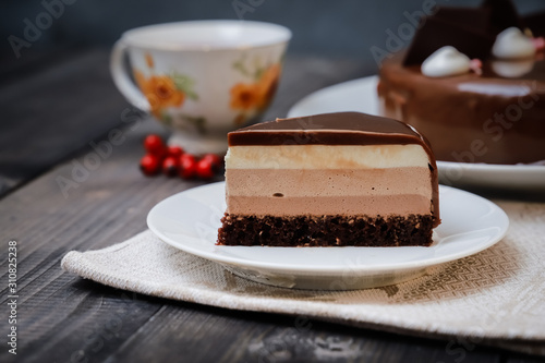 On a dark tabletop on a linen napkin, a tea composition: on a saucer a piece of cake made of three chocolate layers of different colors souffle, covered with glossy chocolate