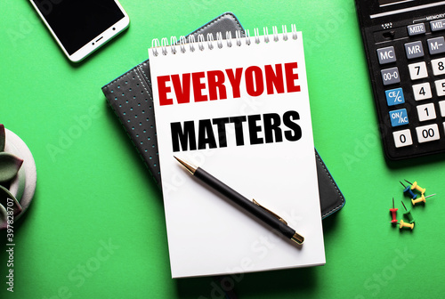 On a green background - a telephone, a calculator and a diary with the inscription EVERYONE MATTERS