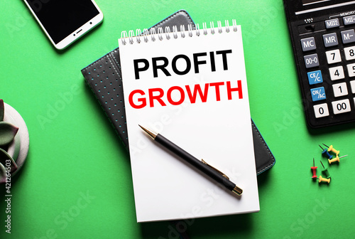 On a green background - a telephone, a calculator and a diary with the inscription PROFIT GROWTH