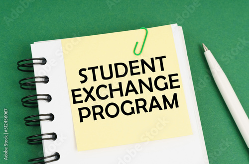 On a green surface, a pen, a notepad with stickers and the inscription - STUDENT EXCHANGE PROGRAM
