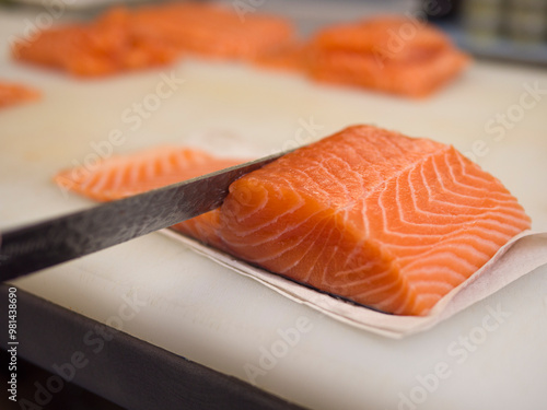 On a kitchen board, a piece of salmon is expertly sliced with a knife. The salmon's vibrant color and smooth texture shine through with every precise slice, highlighting the freshness of the salmon.