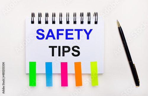 On a light background, a pen, a notebook with the text SAFETY TIPS and bright stickers.
