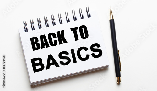 On a light background, a white notebook with the words BACK TO BASICS and a pen.