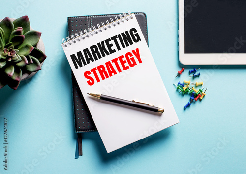 On a light blue background, there is a potted plant, a tablet and a weekly with the text MARKETING STRATEGY