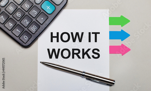 On a light gray background, a calculator, a white sheet with the text HOW IT WORKS, a pen and bright multicolored stickers. View from above