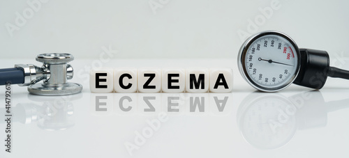 On a reflective white surface lies a stethoscope and cubes with the inscription - ECZEMA