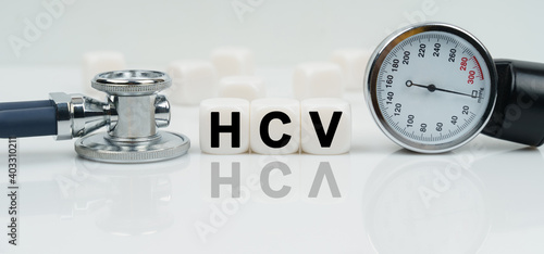 On a reflective white surface lies a stethoscope and cubes with the inscription - HCV
