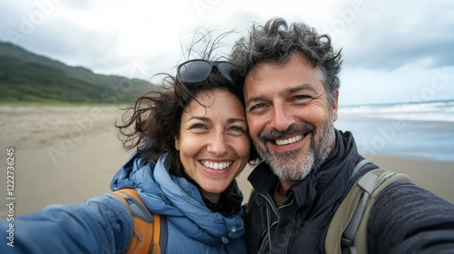 On a serene beach, a happy couple captures a delightful selfie, their smiles glowing amidst the clouds and gentle winds. The moment reflects their bond and love for adventure