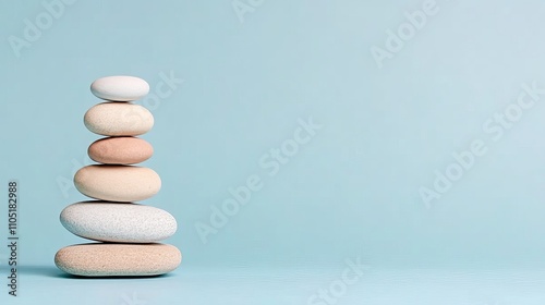 On a sunlit beach, smooth blue pebbles and tranquil sea waves create a serene bokeh effect.