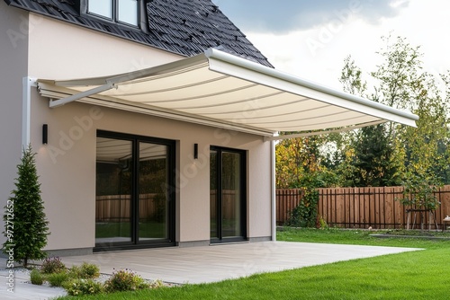 On a sunny day, a classical family house has a wooden patio