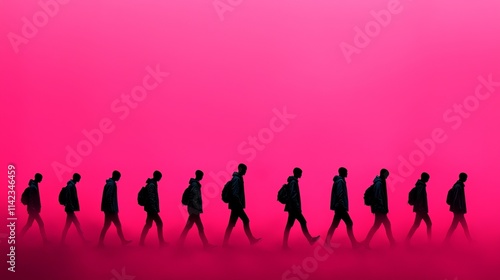 On a vibrant, abstract background are silhouettes of people walking together, symbolizing unity, teamwork, and collective effort.