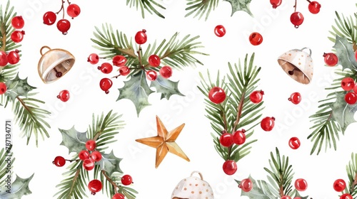 On a white background, a watercolor Christmas seamless pattern with fir branches, berries, stars, and holly bells is depicted.