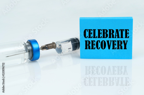 On a white reflective surface there is a syringe with an ampoule and a plate with the inscription - Celebrate Recovery