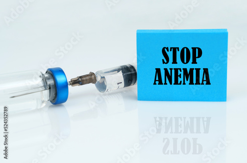 On a white reflective surface there is a syringe with an ampoule and a plate with the inscription - STOP ANEMIA