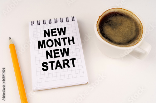 On a white surface, a cup of coffee, a pencil and a notepad with the inscription - NEW MONTH NEW START