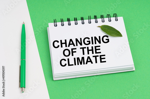 On a white-green background lies a pen, a leaf of a plant and a notepad with the inscription - Changing of the climate