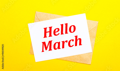 On a yellow background, an envelope and a card with the text HELLO MARCH. View from above