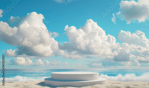 on beach with blue sky and white clouds abstract background. Tropical summer and vacation concept. Graphic rendering illustration design