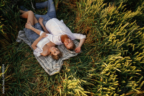On the blanket, lying down, top view. Lovely couple are on the green agricultural field together