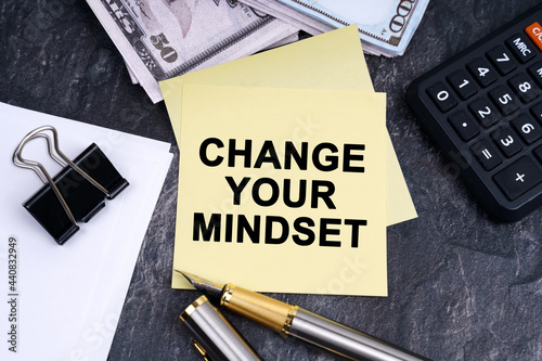 On the table is a calculator, a pen, money and stickers with the inscription - Change your mindset