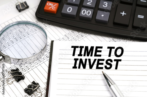 On the table is a magnifying glass, a calculator, a pen and a notebook with the inscription -