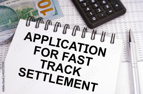 On the table there is money, a calculator and a notebook with the inscription - Application for Fast Track Settlement