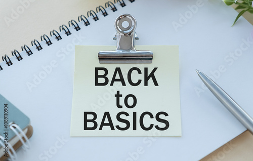 On the tablet for writing text Back to Basics, next to glasses, pen, reports
