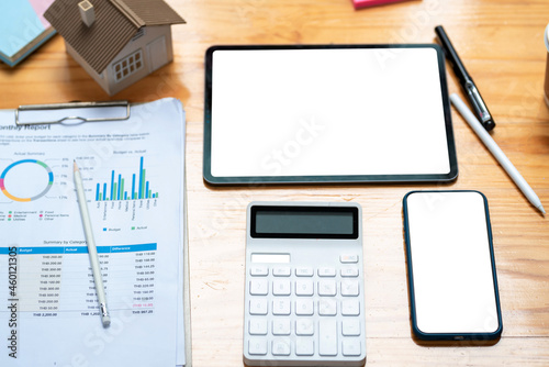 On wooden table in office with tablet smartphone blank screen calculator graph document placed at the office