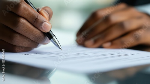 Onboarding, close-up of new hire documents being signed, HR office setting