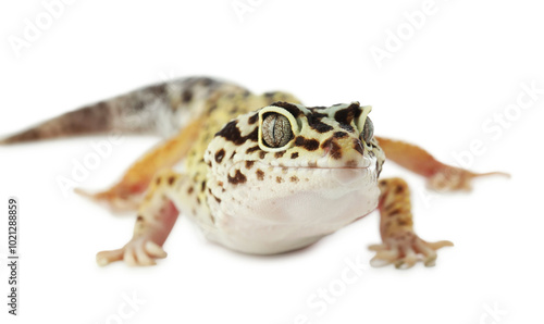 One beautiful gecko isolated on white, macro view. Exotic pet