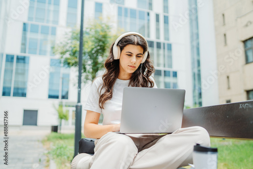 One beautiful young caucasian woman student sitting on bench near university listening to music and studying on laptop