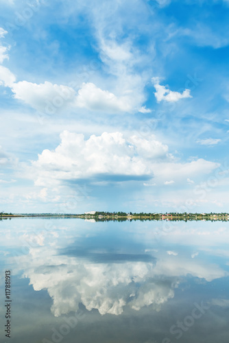one big cloud in blue sky and it reflection in river