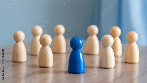 One blue figure stands out among many wooden figures in a group