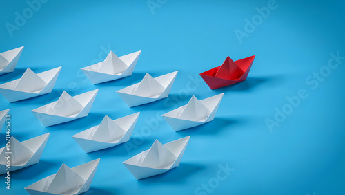 One bright red paper boat leads a fleet of white paper boats across a vibrant blue background symbolizing leadership and individuality