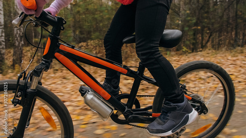 One caucasian children rides bike road in autumn park. Little girl riding black orange cycle in forest. Kid goes do bicycle sports. Biker motion ride with backpack and helmet. Mountain bike hardtail.