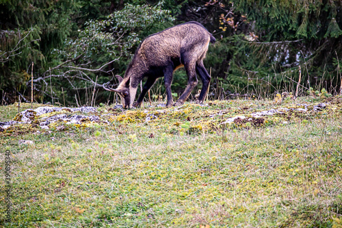 One chamois eating grasses in Jura, Switzerland. Rupicapra rupicapra in natural environment.
