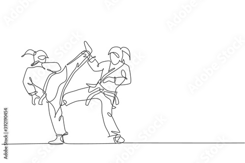 One continuous line drawing of two young talented karateka girls train pose for duel fighting at dojo gym center. Mastery martial art sport concept. Dynamic single line draw design vector illustration