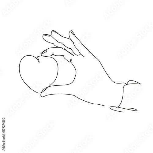One continuous single drawing line art flat doodle between fingers heart in hand heart symbol heart love health. Isolated image hand draw contour on a white background, hand drawn, not AI