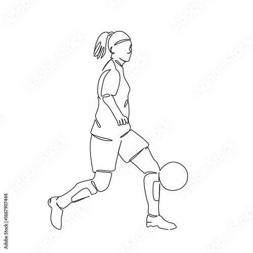 One continuous single drawing line art flat doodle sport, soccer, playing, football, kicking, athlete, competition, girl, ball. Isolated image hand draw contour on a white background, hand drawn, not