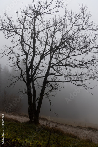 One deciduous tree without leaves is in a forest in autumn in fog. Vertical