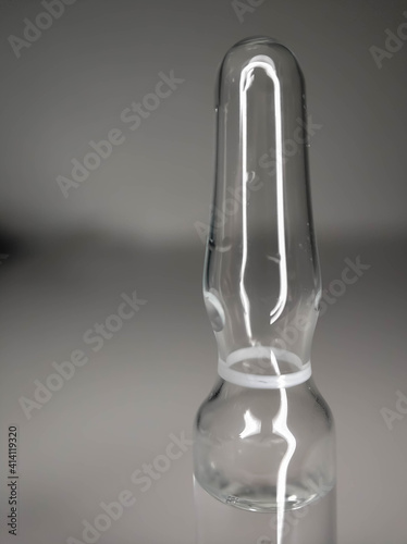 One glass ampoule on a light white background close up