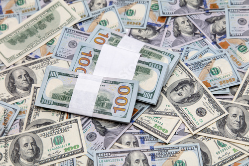 One hundred dollar bills on the table as background