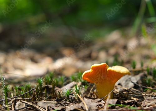 One large, yellow mushroom Cantharellus cibarius grew up in the woods in a clearing on a sunny day. High quality photo. The idea of collecting wild edible mushrooms.