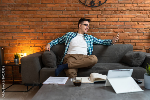 One man young adult male caucasian sitting on the sofa couch at home taking a brake from work using mobile phone for internet browsing online chat or video call happy smile real people copy space