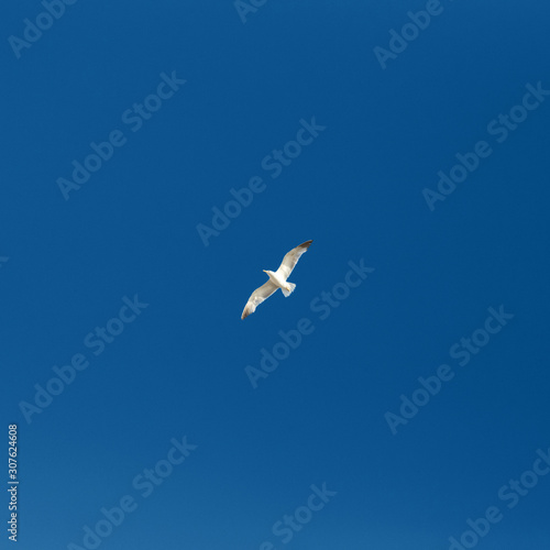 One ocean gull flying in the blue sky.