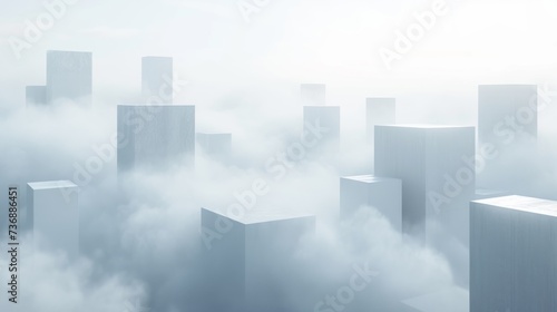 One of the cubes is situated in a city covered with clouds, as part of minimalist stage designs, viewed from a high-angle, with dusty piles and ethereal abstractions on a white background.