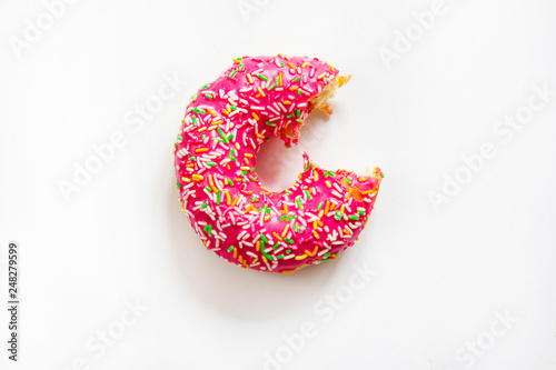 One pink bitten donut cake at white background